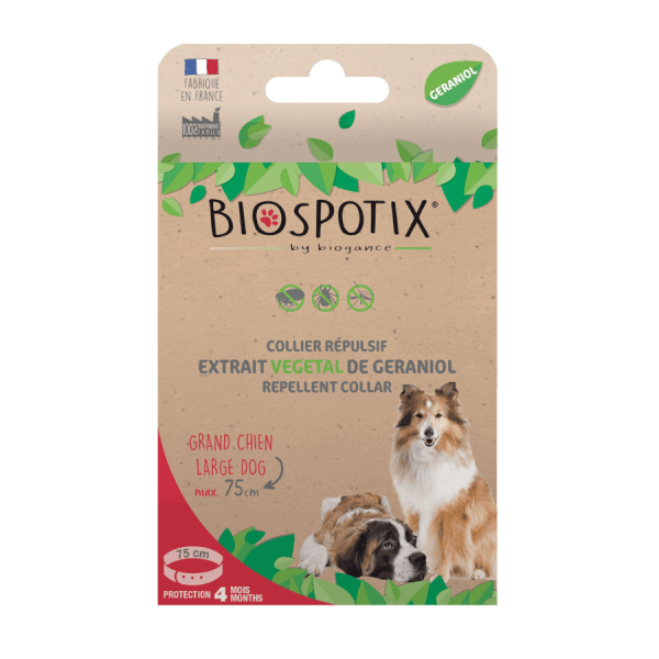 Le Collier Répulsif Naturel BIOSPOTIX est une solution innovante et respectueuse de l’environnement pour lutter contre les parasites externes. À base d’huiles essentielles de géraniol, il offre une protection naturelle contre les puces, tiques et moustiques, sans perturber l’organisme de votre animal ni émettre de substances toxiques.