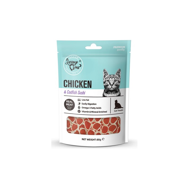 Offrez à votre chat une friandise délicieuse et saine avec les sushis Jerky Time au poulet et à la morue. Riches en protéines et faibles en matières grasses, ces en-cas savoureux sont parfaits pour récompenser votre compagnon tout en contribuant à son bien-être général.