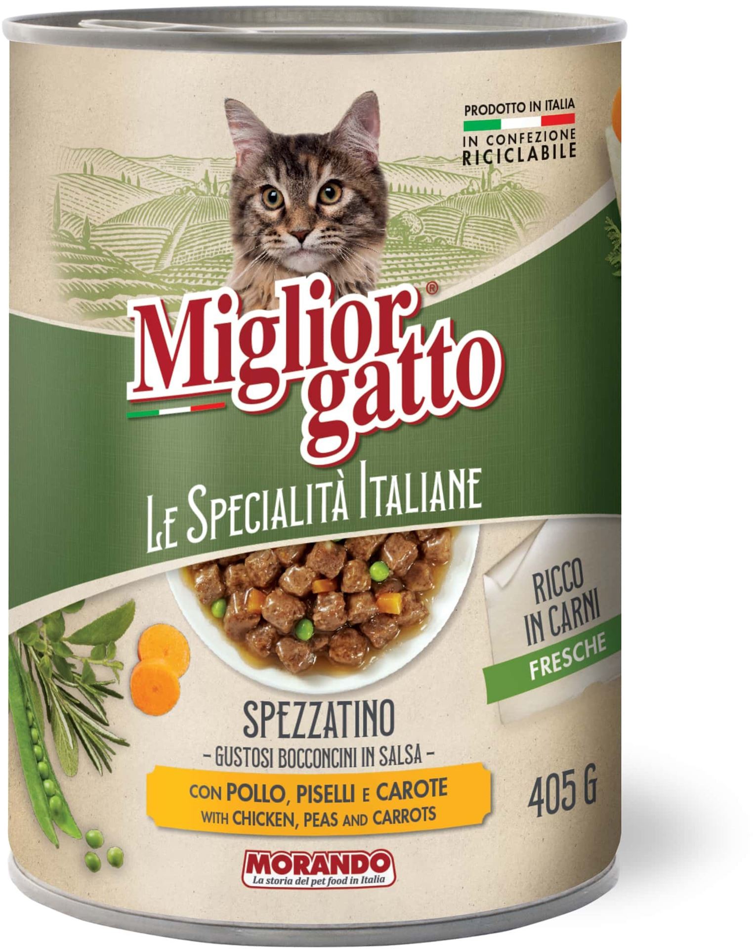 Offrez à votre chat un repas gourmand et équilibré avec la boîte Migliorgatto – Le Specialità Italiane. Inspirée de la cuisine familiale italienne, cette recette en sauce marie du poulet tendre, des carottes croquantes et des petits pois riches en fibres, pour une alimentation humide complète et appétente.